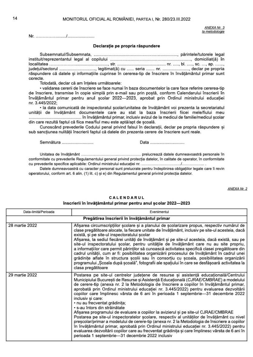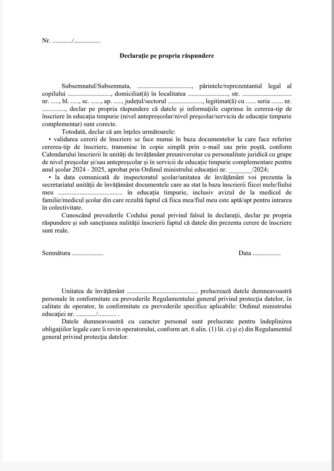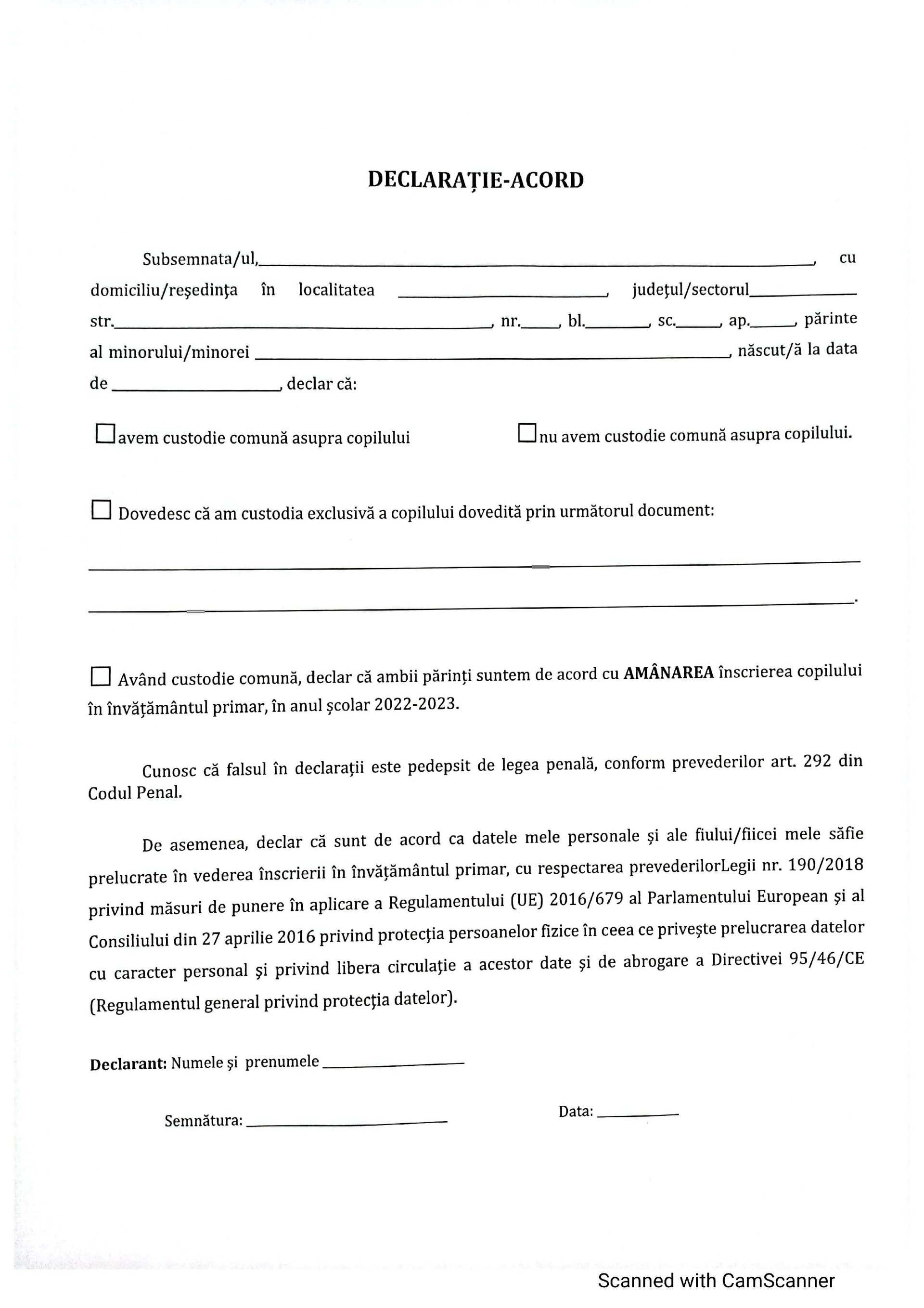Declarăm că, în calitatea pe care o avem, ne angajăm să respectăm, pe toată perioada participării copilului nostru la programul educativ, toate reglementările interne ale unităţii de învăţământ, precum şi hotărârile Consiliului de administrație al acesteia.