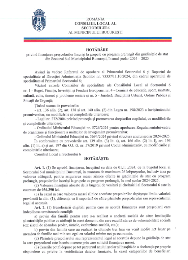 Hotarare a Consiliului Local, sector 6, privind finantarea prescolarilor inscrisi la grupele cu program prelungit din gradinitele de stat din sectorul 6, anul scolar 2024-2025.