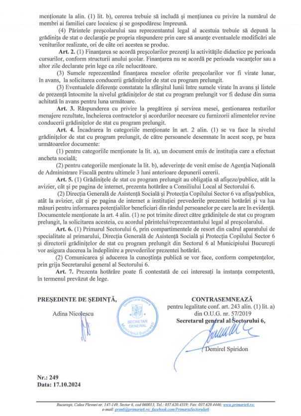 Hotarare privind finanțarea meselor acordate unor categorii de preșcolari înscriși în grădinițele de stat din Sectorul 6 al Municipiului București, la grupele cu program prelungit, în anul școlar 2023 – 2024