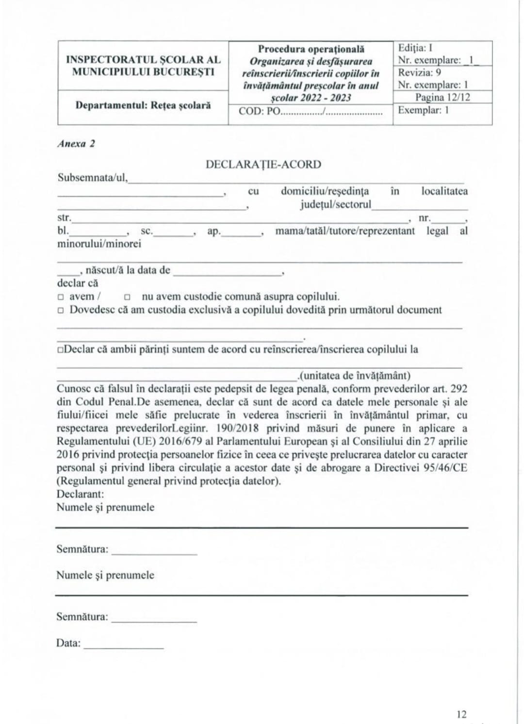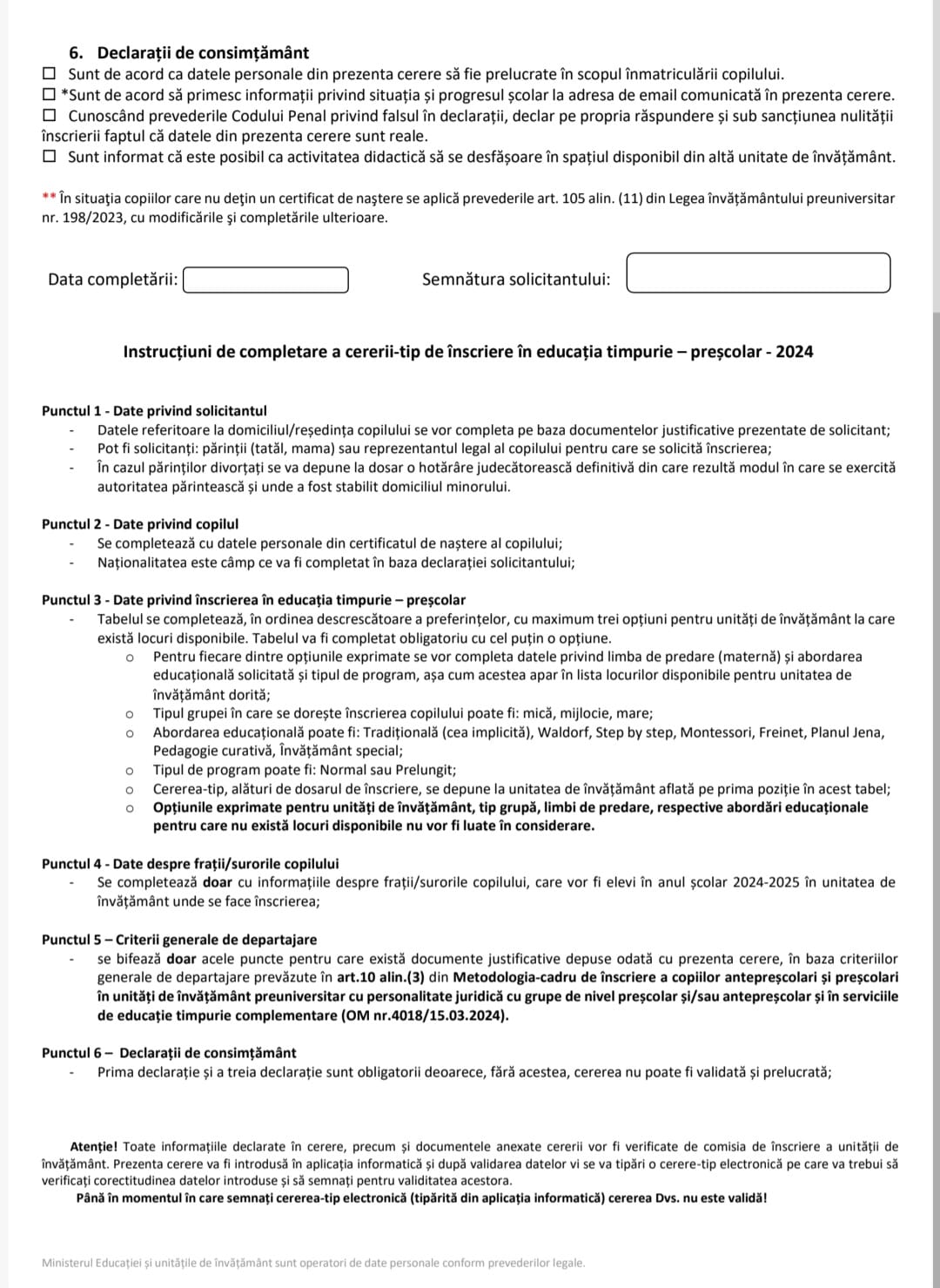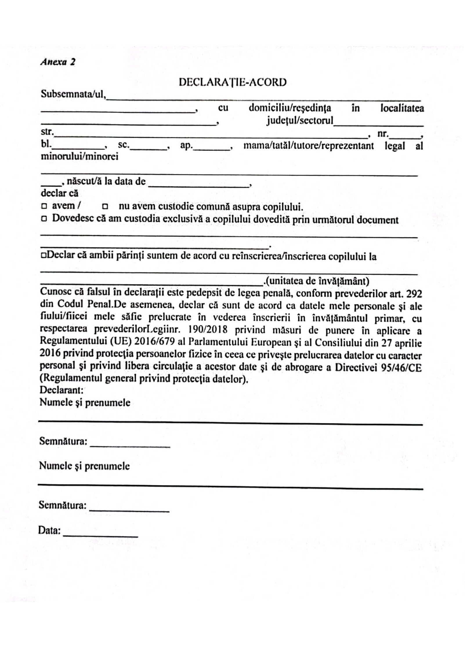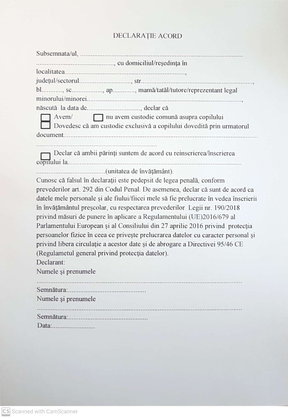 -declarația acord de înscriere la unitatea silicitată (conform celor 3 opțiuni- se completeaza cate o declaratie pentru fiecare grădinita pentru care doriti înscrierea!) semnată de ambii părinți;
