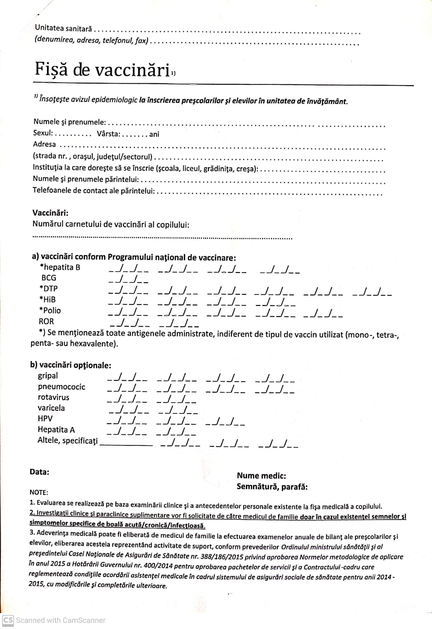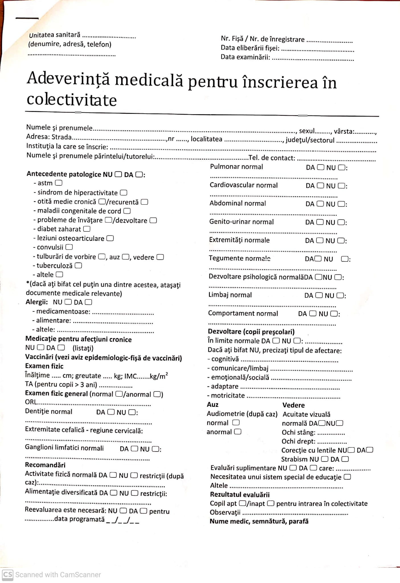 - Fișa medicală, completată potrivit reglementărilor în vigoare, eliberată de de medicul de familie(se poate depune și la momentul începerii anului școlar).