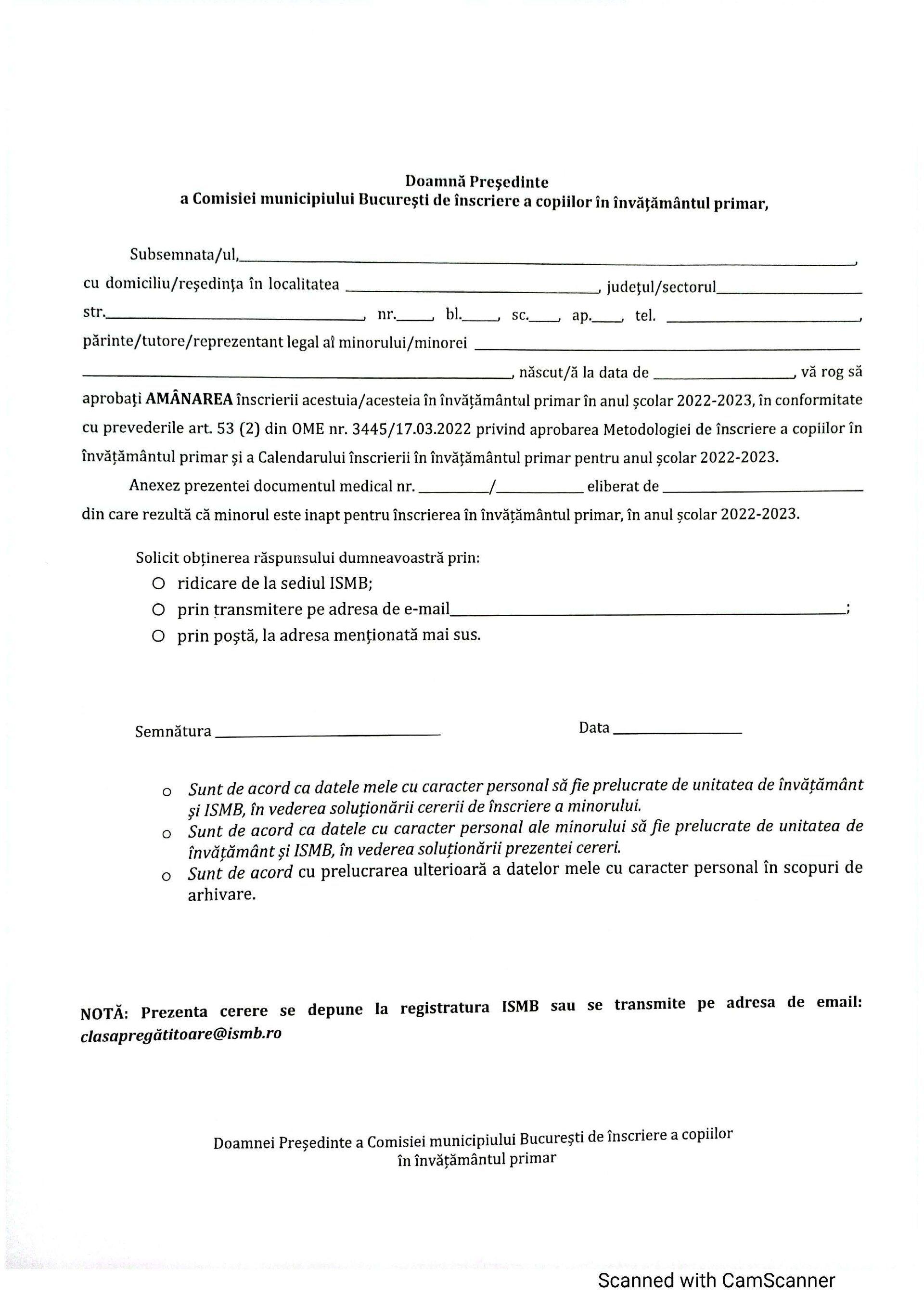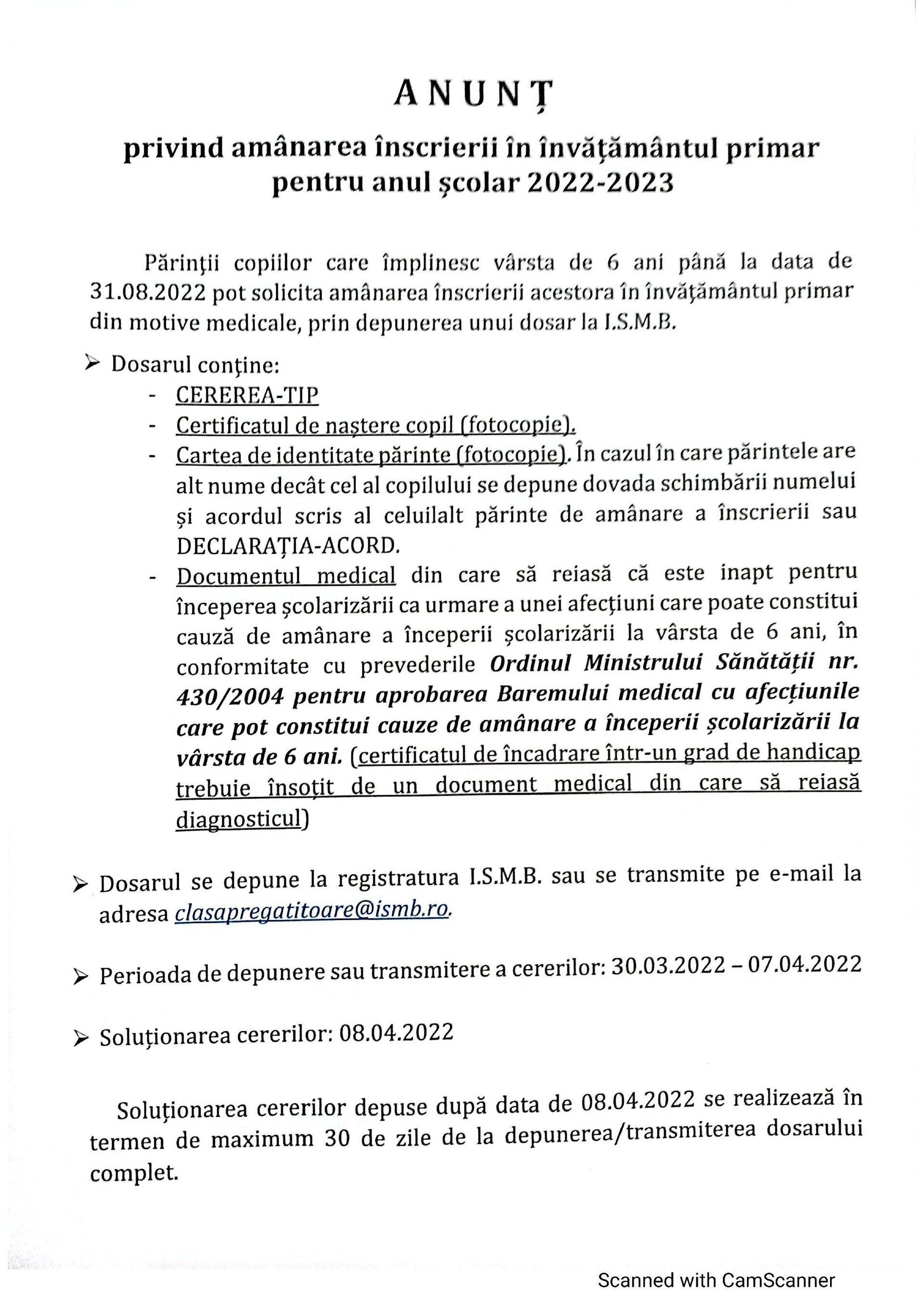-avizul ISMB pentru copiii pentru care s-a solicitat amânarea înscrierii la clasa pregătitoare, în anul școlar 2021-2022, din motive medicale;