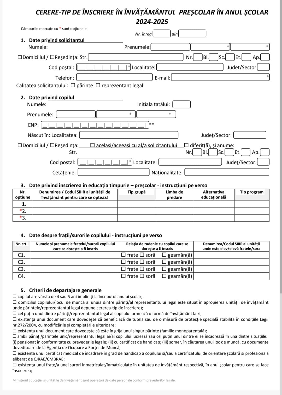Cerere tip de inscriere in invatamantul prescolar in anul scolar 2024-2025